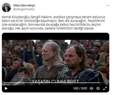 Çiğli Belediye Başkanı Utku Gümrükçü, Kılıçdaroğlu'nun bu paylaşımını alıntılayarak 'Cesur Yürek' filminden bir kesit paylaştı. Gümrükçü yaptığı paylaşımda; aralıksız çalışarak seçimleri kazanacakları ve millet iradesinin söz sahibi olacağı mesajını verdi.