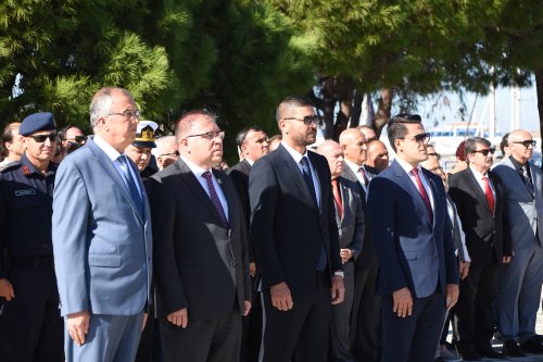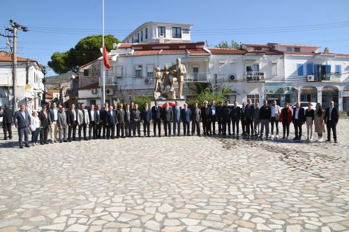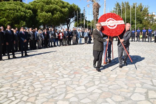 Foça Kaymakamı Mehmet Türköz, Belediye Başkanı Fatih Gürbüz, daire amirleri, sivil toplum kuruluşları ve siyasi parti temsilcilerinin katıldığı törende; Foça muhtarları tarafından Cumhuriyet Meydanı'ndaki Atatürk Anıtı'na saygı çelengi sunuldu.