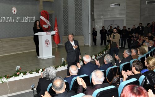 Bornova Belediye Başkanı Dr. Mustafa İduğ, yeni yıl pastasını emekli olan belediye bürokratı Satiye Uygun, meclis üyeleri, müdürler ve muhtarlarla birlikte kesti.