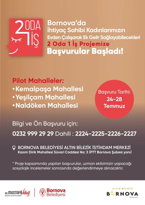 Kadınların toplumsal hayatın her alanında güçlü bir şekilde yer alması adına çalışmalar yapan Bornova Belediyesi, yeni projesi ‘2 Oda 1 İş’ ile kadınlara iş imkanı sağlıyor. Kadınların kendi ayaklarının üzerinde durması için Altın Bilezik İstihdam Merkezi tarafından hazırlanan projeden, sosyal yaşama katılma ve dışarıda çalışma olanağına sahip olamayan, engelli veya engelli bir bireyin bakımından tek başına sorumlu olan, şiddet mağduru ya da üç yaşından küçük çocukların bakımından tek başına sorumlu olan kadınlar yararlanabilecek. Projeye katılanlar sosyal güvenceye sahip olurken, eğitim alarak sertifika almaya da hak kazanacak.