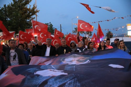 Güzelbahçe Maltepe Mahallesi Tabaoğlu Parkı’nda toplanan Cumhuriyet sevdalısı yüzlerce Güzelbahçeli, ellerinde Türk Bayrağı ve meşalelerle yaklaşık iki kilometre sahil boyunca yürüdü. Marşlar eşliğinde yürüyen Güzelbahçeliler “Yaşasın Cumhuriyet “Mustafa Kemalin Askerleriyiz” “Bu-ra-da-yız” sloganı atarak yürüyüşlerini Güzelbahçe Atatürk Kültür Merkezi önünde tamamladı.