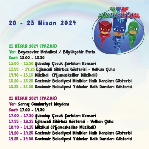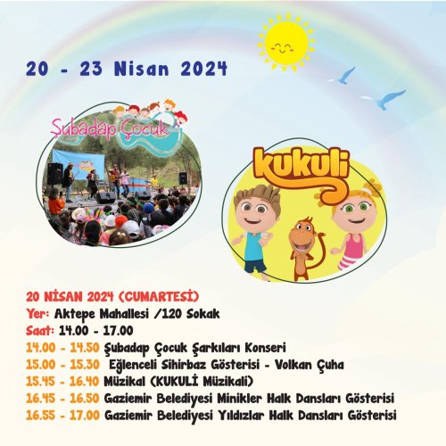 Gaziemir Belediyesi’nin 23 Nisan Ulusal Egemenlik ve Çocuk Bayramı kutlamaları kapsamında düzenleyeceği 26. Gaziemir Ulusal Çocuk Şenliği başlıyor. 20-23 Nisan tarihlerinde düzenlenecek şenlik kapsamında her gün ilçenin farklı bir bölgesinde çocuklar için etkinlikler düzenlenecek. Şenlikte sahnelenecek müzikallerle, çocuklar sevdikleri çizgi film kahramanlarıyla bir araya gelecek. Kukuli, Pijamaskeliler, Aslan, Kral Şakir Kapadokya Macerası gibi müzikal gösterileriyle ve Şubadap Çocuk Şarkıları Konseri, Volkan Çuha Eğlenceli Sihirbaz Gösterisi’yle çocuklar keyifli saatler yaşayacak. Gaziemir Belediyesi Halk Dansları Topluluğu’nun minikler ve yıldızlar grupları da danslarıyla şenliğe renk katacak.