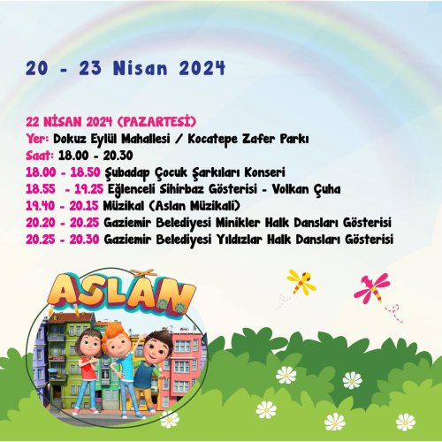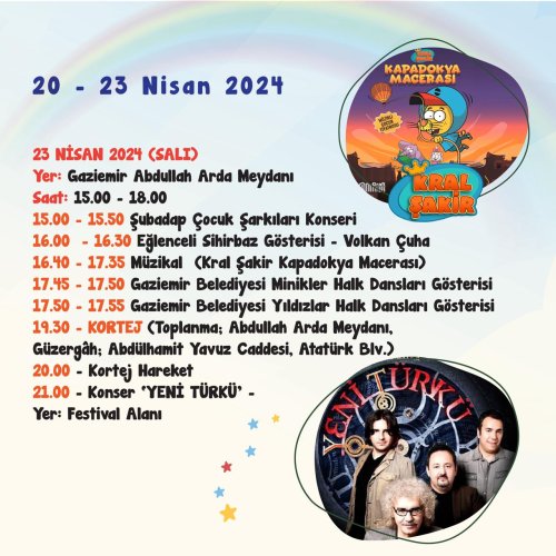 Şenlik kapsamında 23 Nisan Salı günü kortej yürüyüşü düzenlenecek. Abdullah Arda Meydanı’nda saat 20.00’de başlayacak korteje katılanlar, Abdülhamit Yavuz Caddesi ve Atatürk Bulvarı güzergâhından Festival Alanı’na ulaşacak. Büyük boy Atatürk posteri ve Türk bayrağının taşınacağı kortejde, bando eşliğinde marşlar söylenecek. Kortej yürüyüşünün ardından 23 Nisan kutlamaları Festival Alanı’nda düzenlenecek Yeni Türkü konseriyle devam edecek. Yeni Türkü saat 21.00’de sahneye çıkacak.