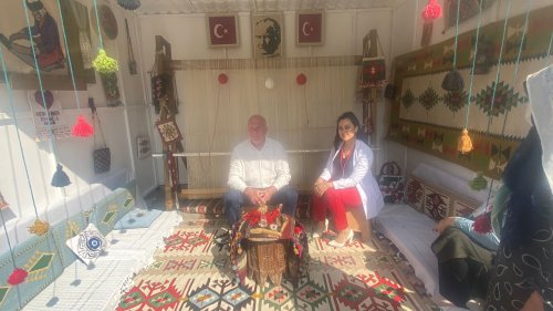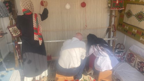 Etkinlik öncesi halı dokuma tezgahını ziyaret eden Kemalpaşa Belediye Başkanı Rıdvan Karakayalı, halı dokuma ustalarıyla birlikte ilmekler atarak etkinliğe destek verdi.