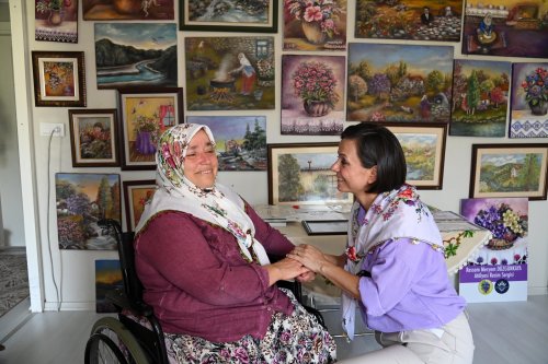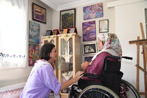Karabağlar Belediye Başkanı Helil Kınay, Kavacık Köyü’nde yaşayan yürüme engelli ressam Meryem Düzgünkaya’yı evinde ziyaret etti.