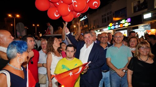Sıdıka Kelami Ertan Ortaokulu önünden başlayarak Cumhuriyet Meydanı’na kadar devam eden Fener Alayına katılan vatandaşlar ellerinde Türk Bayrakları ve meşaleler ile marşlar eşliğinde kent meydanında yürüdü. Çeşme Belediye Bandosu da korteje eşlik etti.