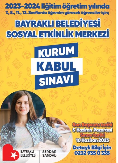 Eğitim alanındaki yatırımları ve başarılarıyla fark yaratan Bayraklı Belediyesi, bünyesindeki Bayraklı Sosyal Etkinlik Merkezi için 2023-2024 eğitim-öğretim yılı Kurum Kabul Sınavı yapacak. 19 sınıf ve bin 200 öğrenci kapasiteli eğitim merkezi için yeni sezonda da 7’nci, 8’inci, 11’inci ve 12’nci sınıflara alım yapılacak. Bu kapsamda 2023-2024 eğitim öğretim yılında da ücretsiz eğitim alacak öğrenciler kurum kabul sınavı ile belirlenecek. Sınav için son başvuru 5 Haziran’a kadar yapılabilecek, sınav ise 10 Haziran’da gerçekleştirilecek. Öğrenciler, ücretsiz eğitim fırsatı hakkında detaylı bilgiye 0232 935 0 335 numaralı telefondan ulaşabilecek.