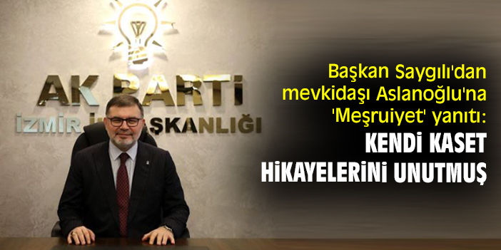 AK Parti İzmir İl Başkanı Bilal Saygılı, CHP İzmir İl Başkanı Şenol Aslanoğlu'nun 'Meşrutiyet' çıkışına, "Şaibelerinin hesabını tek satır verememiş; Kendi kaset hikâyelerini unutmuş; Konuşuyor… Konuşuyor… " şeklinde yanıt verdi.