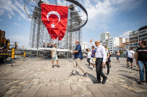 İzmir Büyükşehir Belediye Başkanı Tunç Soyer, 9 Eylül için Gündoğdu Meydanı’nda süren çalışmaları inceledi.