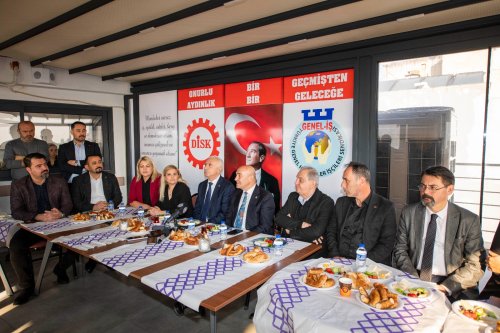 İzmir Büyükşehir Belediye Başkanı Tunç Soyer, Devrimci İşçi Sendikaları Konfederasyonu (DİSK) Ege Bölge Temsilciliği’nin daveti üzerine işçilerle buluştu. DİSK’in Basmane semtinde bulunan sendika binasında yüzlerce işçi tarafından alkışlar ve sloganlarla karşılanan Başkan Tunç Soyer’e, CHP İzmir Milletvekili Rıfat Nalbantoğlu ile İzmir Büyükşehir Belediyesi Genel Sekreteri Barış Karcı da eşlik etti. Buluşmada, “Kurtuluş yok tek başına, ya hep beraber ya hiç birimiz”, “Asla yalnız yürümeyeceksin” sloganları atıldı.