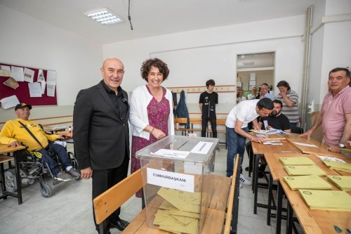 İzmir Büyükşehir Belediye Başkanı Tunç Soyer, Cumhurbaşkanlığı ikinci tur seçiminde oyunu eşi Neptün Soyer, kızları Defne ve Duygu ile Ulamış Ortaokulu'nda kullandı.