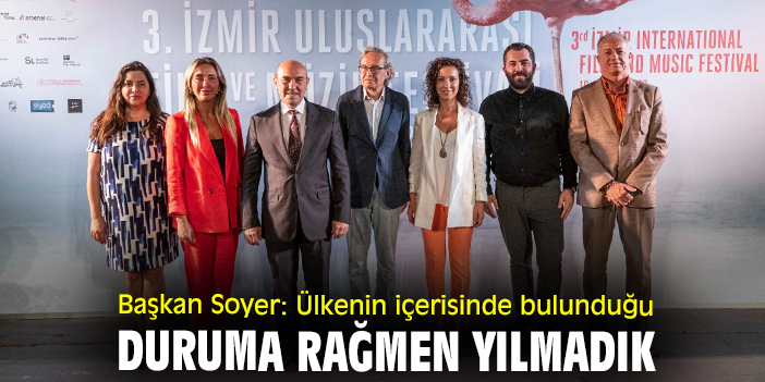 Üç yıl önce ilk İzmir Uluslararası Film ve Müzik Festivali’ni ortaya çıkaran yönetmen Vecdi Sayar’a teşekkürlerini sunan Başkan Soyer, “Müziksiz sinema düşünemezsiniz. O nedenle bu iş çok kıymetli. Göreve geldiğimizde İzmir, sanata ev sahipliği yapan bir şehir olsun istemiştik. O yüzden de işe Sinema Ofisi kurarak başlamıştık. Sinema Ofisi artık İzmir’de yetkin otorite kabul edilen bir kurum haline geldi. Gelecekte İzmir’in sinema sektörüne ev sahipliği yapmasında altlık oluşturdu. Yapacaklarımız ne sadece sinema ofisiyle sınırlı kalacak ne de festivallerle. İzmir, sektöre ev sahipliği yapacak güce sahip. O yüzden iddiamız ve heyecanımız büyük. İzmir’in önemli markalarından bir haline gelecek bu festival. Üç yıldır küçük adımlarla yürünen bu yolculukta aslında ufkumuz biraz daha genişliyor. Önümüzdeki yıllarda çok daha iyilerini yaşayacağımızı biliyorum. İzmir çok önemli bir marka kazandı ve bu markayı layığıyla taşıyacak. Sponsorlarımıza çok teşekkür ediyoruz. Türkiye’nin içerisinde bulunduğu duruma rağmen yılmadık. Tüm kaynaklarımızı seferber ederek festivalimizi gerçekleştireceğiz” diye konuştu.