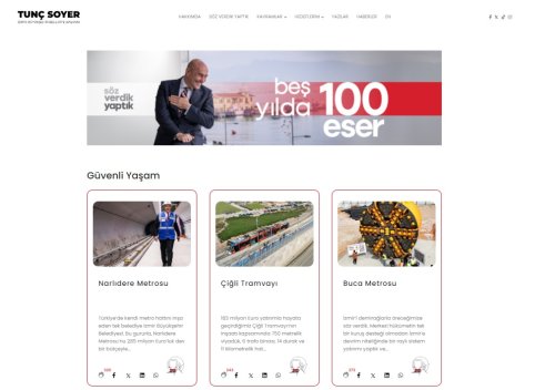 İnternet sitesinin “Söz verdik yaptık” sekmesinin altında ise Başkan Soyer’in 2019 yılında göreve geldiğinde İzmir’e sözünü verdiği 165 projenin tamamlanan 144 projesine dair tüm içeriklerin yer aldığı Söz verdik yaptık kitabının dijital hali yer alıyor. Kitap, İzmir’de ve Türkiye’de yaşanan tüm zorluklara rağmen büyük bir iradeyle hayata geçirilen çalışmaları verilerle ortaya koyuyor.
