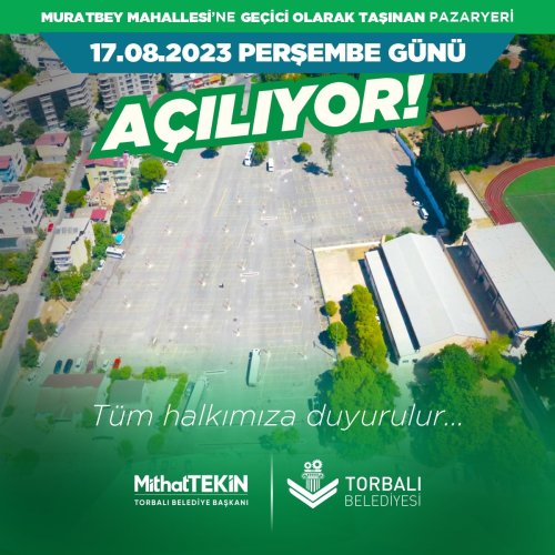 MEDYA EGE - Torbalı'da yıllardır Tepeköy Mahallesi'ne kurulan semt pazarı, Torbalı'nın mega projesi olan meydan projesi nedeniyle geçici olarak Muratbey Mahallesi'ne taşınıyor. Pazaryerinin açılışı 17 Ağustos Perşembe günü gerçekleştirilecek.