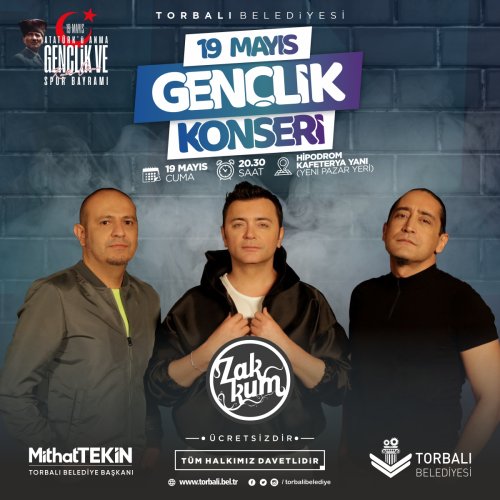 Cuma akşamı gerçekleşecek olan Gençlik Konserine ilçe sakinlerini davet eden Torbalı Belediye Başkanı Mithat Tekin, “19 Mayıs Atatürk’ü Anma, Gençlik ve Spor Bayramı nedeniyle düzenleyeceğimiz Gençlik Konserinde Zakkum’u ilçemizde ağırlayacağız. Ücretsiz konserimize tüm halkımız davetlidir. Ulu Önder Gazi Mustafa Kemal önderliğinde 104 yıl önce Cumhuriyetimizin temellerinin atıldığı bu önemli günü gelin hep beraber kutlayalım” ifadelerini kullandı.