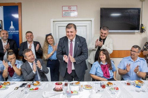 İzmir Büyükşehir Belediye Başkanı Dr. Cemil Tugay, “Sizleri gördüğümde her zaman mutlu oluyorum. Hep beraber hem bir görevi yerine getirmeye, aslında zor olan da bir şeyleri başarmaya çalışıyoruz. İçinde bulunduğumuz şartlar zaman zaman hepimizi çok yoruyor, zaman zaman zorluyor. Ne olursa olsun bu bizim işimiz, bu şehir bizim şehrimiz, bu ülke bizim ülkemiz. Sonuna kadar sahip çıkmaya, mücadele etmeye devam edeceğiz. Benim görev aldığım dönemde, benimle beraber sorumluluk alan arkadaşlarımla hep beraber hem şehrimize daha iyi hizmet etmek için, hem de sizlerin hakkını hukukunu savunmak ve daha iyi şartlarda çalışmanız için sonuna kadar mücadele etmekten vazgeçmeyeceğiz. Her geçen gün daha iyiye gittiğimizi gözlüyorum, buna sizin de inancınız tam olsun. Yüreğiniz ferah olsun, güzel bir bayram geçirin. Ailelerinizin sevdiklerinizin kıymetini bilin. Onlarla birlikte güzel vakit geçirmeye çalışın. Bizim de burada hep beraber kocaman bir aile olduğumuzu, güzel bir kaderi hep beraber paylaşacağımızı lütfen unutmayın. Sizleri seviyorum, bayramınız kutlu olsun” diye konuştu.