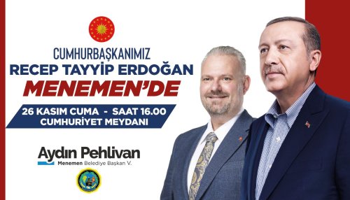 Cumhurbaşkanı Recep Tayyip Erdoğan'ın 26 Kasım Cuma günü saat 16.00'da Menemen Cumhuriyet Meydanı'nda düzenlenen mitingle halka sesleneceğini belirten Menemen Belediye Başkan Vekili Aydın Pehlivan, "Bu ziyaret, bizler için onur ve gurur kaynağıdır. Dünya lideri, Cumhurbaşkanımız Sayın Recep Tayyip Erdoğan, güzel İzmir’imize her gelişinde yaptığı yatırımlarla artı değer yaratırken verdiği müjdelerle de gelecek için umutlarımızı büyüttü. 26 Kasım Cuma günü saat 16.00'daki Menemen programı ile de biz Menemenlileri onurlandıracak" dedi.