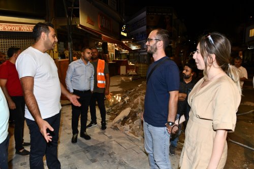 Çiğli Belediye Başkanı Onur Emrah Yıldız, Kasaplar Meydanı yolu zemin yenileme çalışmalarını sürdüren personele gece mesaisinde destek ziyaretinde bulundu. Yıldız, "Sözle değil emekle güzelleştireceğiz" dedi.