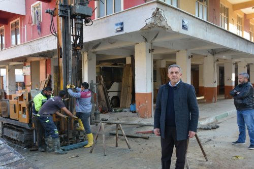 Başkan Yılmazlar, Cumhuriyet Mahallesi’nde Pazaryeri ve Düğün Salonu olarak kullanılan binanın, statik ömrünü tamamlaması nedeniyle Beydağ Belediyesi'nin başlattığı çalışmaları yerinde inceledi.