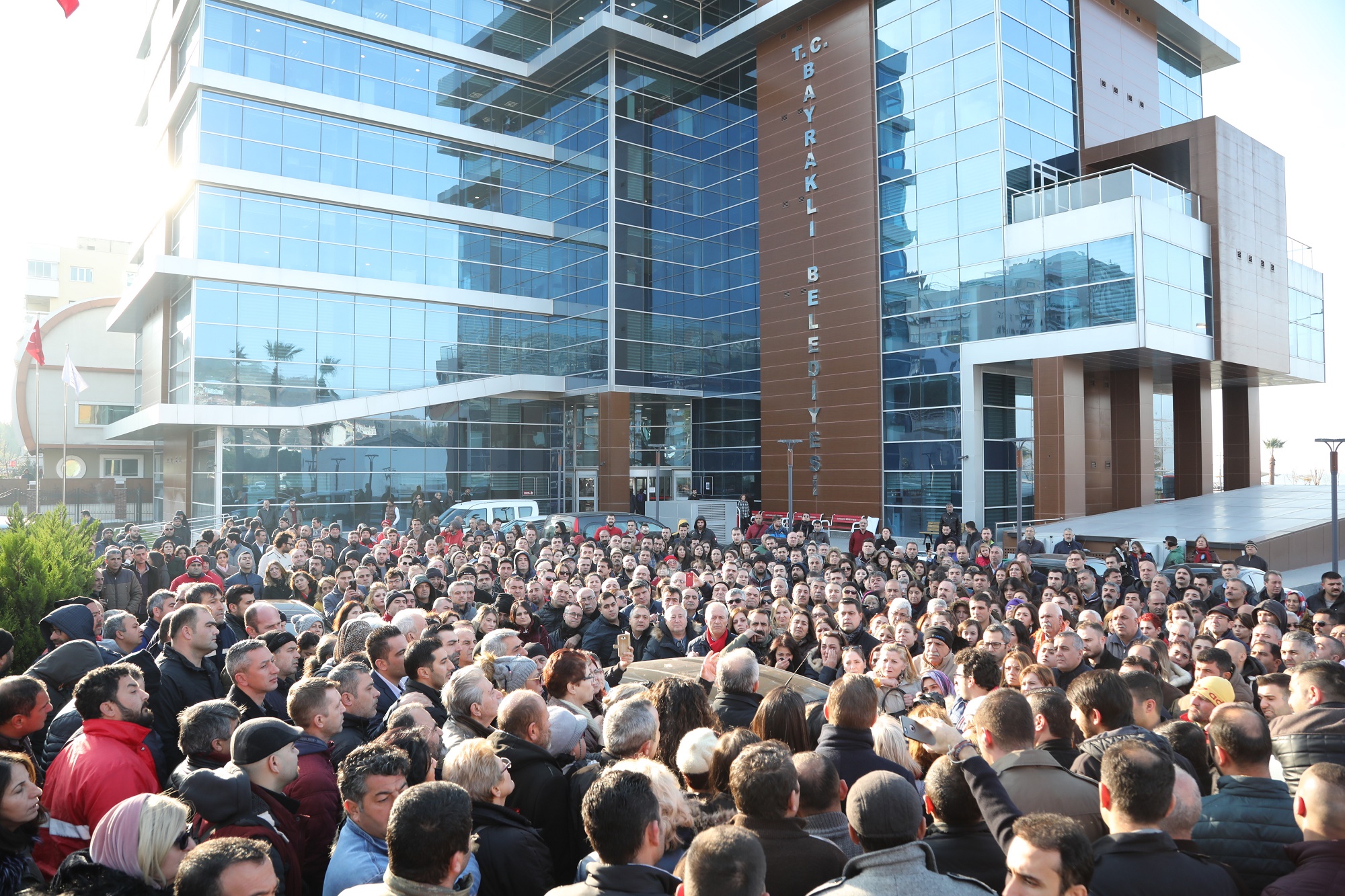 Bayraklı Belediye binası önünde toplanarak sloganlar atan çok sayıda personel ve vatandaşlar Başkan Hasan Karabağ’a destek mesajları vererek, Büyükşehir olmasa da Bayraklı’da bir dönem daha kalmasını istedi. Duygusal anların yaşandığı buluşmada vatandaşlar gözyaşlarını tutamadı.
