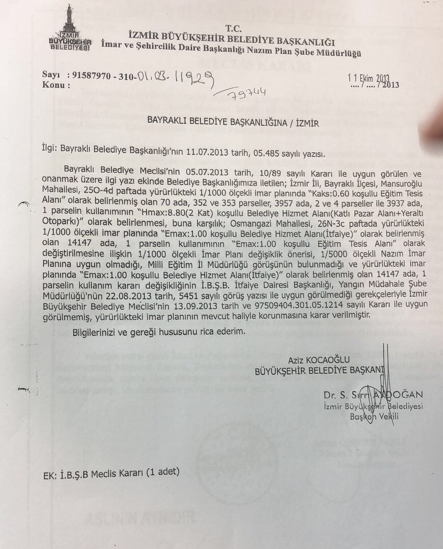 Bayraklı Belediyesi, Büyükşehir Belediyesi’ne Osmangazi’deki Bayraklı Belediyesi’ne ait planlarda “Belediye hizmet alanı (itfaiye) olarak belirlenen yerin “Eğitim tesis olanı olarak” belirlenmesini önermiş, takas teklifinde bulunmuştur. Ancak bu plan değişikliği talebi Büyükşehir Belediyesi tarafından kabul görmemiştir. İzmir Büyükşehir Belediyesi, “İmar planlarının mevcut haliyle korunmasına karar vermiştir. Söz konusu yerin (Telekom’un arkası) Bayraklı Belediyesi'ne ait 1732 metrekaresi Bayraklı İlçe Milli Eğitim Müdürlüğü’nünün talebi üzerine alana ortaokul yapılması amacıyla belediye meclisimizce alınan kararla tahsis edilmiştir. Ruhsat işlemleri geçtiğimiz ay başlatılmıştır. Konu bu kadar açıkken, pazarcı esnafımızı ve kamuoyunu yanıltıcı açıklamaların altına imza atanlar bu konudan siyasi rant elde edemeyecek ve beklentileri boşa çıkacaktır. Ayrıca Valilik tarafından belediyemize “bu konuyla” ilgili yazılan herhangi bir yazı bulunmamaktadır.