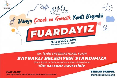 İZFAŞ tarafından İzmir Büyükşehir Belediyesi’nin ev sahipliğinde,03 – 12 EYLÜL 2021 tarihleri arasında, İzmir Uluslararası Fuar Alanı / Kültürpark’ta 90. kez kapılarını açmaya hazırlan fuarda “Dünya Çocuk ve Gençlik Kenti Bayraklı” temasıyla katılacak olan Bayraklı Belediyesi stanttı ilgi uyandıracak etkinlik ve tanıtım faaliyetleriyle ziyaretçilerini ağırlayacak.