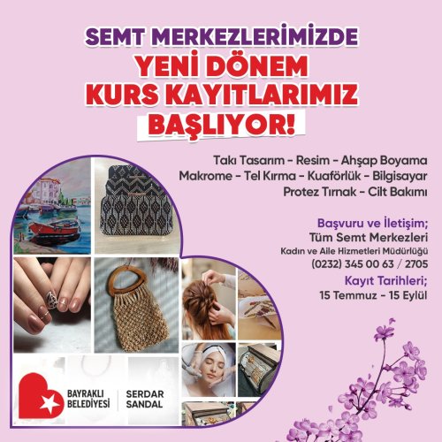 Bayraklılı kadınlara yeni hobi alanları açmak ve meslek edindirmek için çalışmalarını sürdüren Bayraklı Belediyesi, yeni dönemde de yüzlerce kadına ücretsiz kurs imkanı sağlayacak. Bu kapsamda takı-tasarım, resim, ahşap boyama, makrome, tel kırma, kuaförlük, bilgisayar, protez tırnak ve cilt bakımı kursları verilecek. Bayraklı Belediyesi Kadın ve Aile Hizmetleri Müdürlüğü ile Halk Eğitim Merkezi iş birliğiyle düzenlenecek kurslara tüm ilçe sakinleri ücretsiz olarak katılabilecek. Semt merkezlerinde 9 branşta açılacak hobi ve meslek edindirme kursları ile ilgili detaylı bilgiye 0232 345 00 63 telefon numarasından ulaşılabilecek. Kurs kayıtları 15 Eylül’de sona erecek.