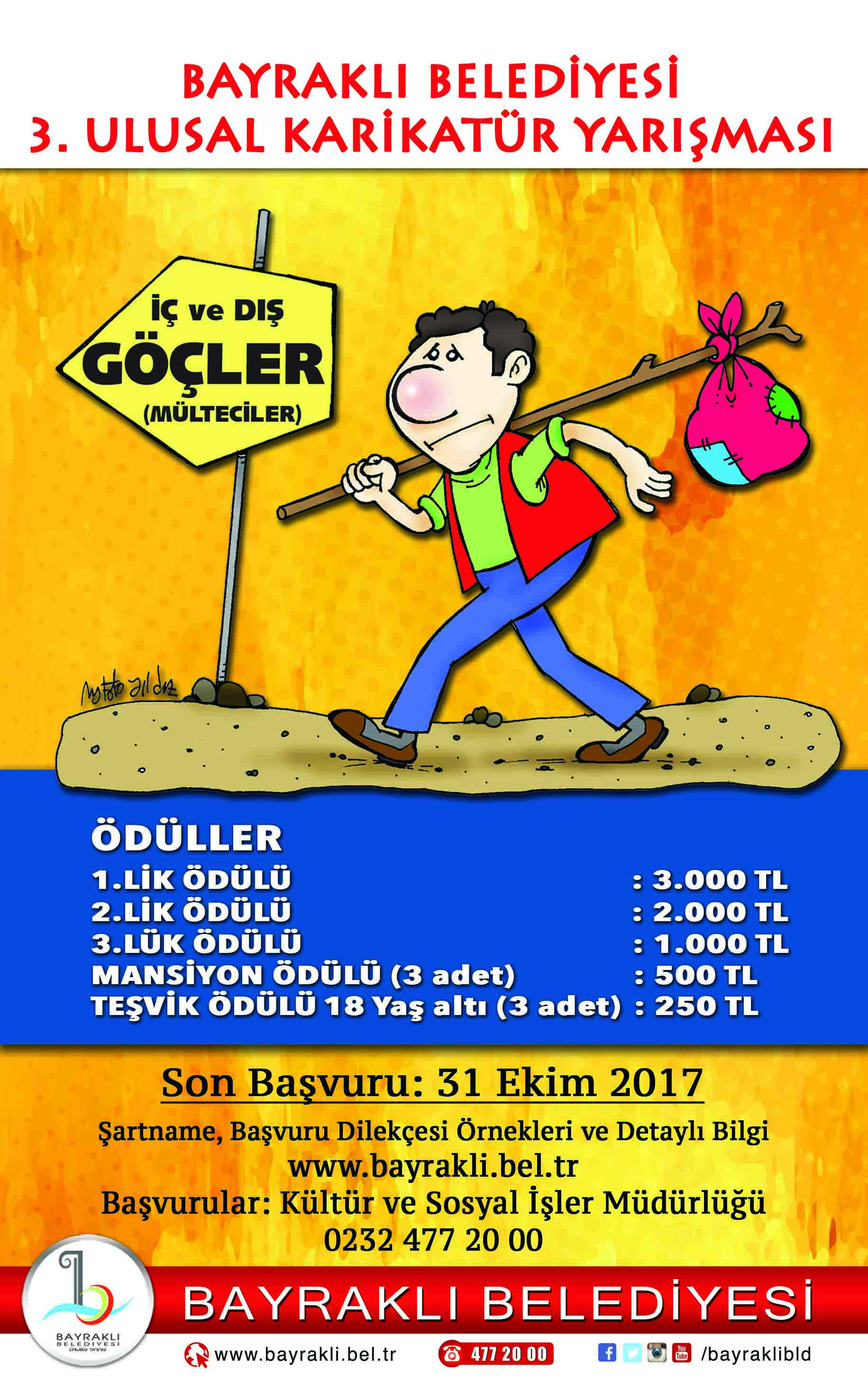 Bayraklı Belediyesi tarafından düzenlenen karikatür yarışmasına başvurular 31 Ekim’de sona erecek. Konusu “İç ve dış göçler-mülteciler” olarak belirlenen yarışmaya isteyen herkes başvurabilecek.