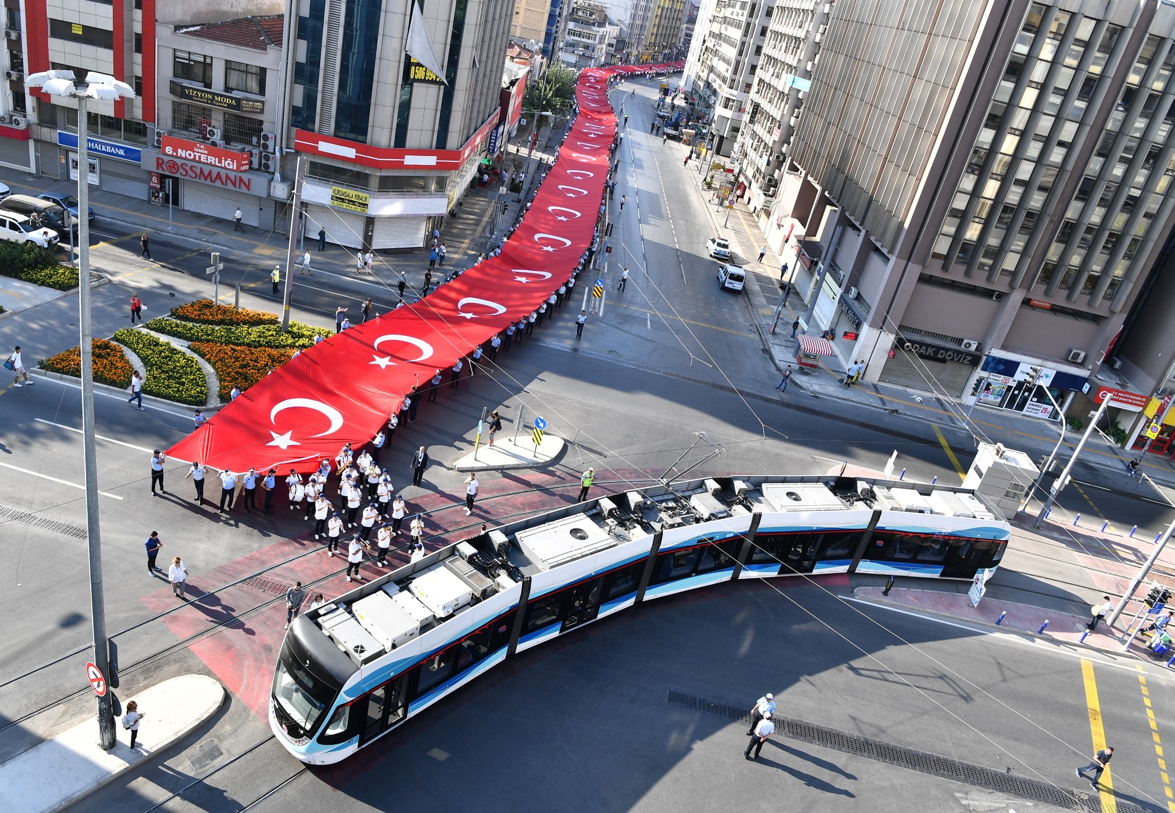 İzmir Büyükşehir Belediyesi'nin hazırladığı 350 metre uzunluğundaki Türk bayrağını taşıyan İzmirliler; Türk ordusunun kente girdiği tarihi güzergahı izleyerek Gaziler, Anafartalar ve İkiçeşmelik caddeleri üzerinden Cumhuriyet Meydanı'na ulaştı. Marşlar eşliğinde ilerleyen korteje çevredeki vatandaşlar da alkışlarla destek verdi. İzmir Büyükşehir Belediyesi bandosunun eşlik ettiği yürüyüşün ardından, Cumhuriyet Meydanı’ndaki Atatürk anıtına çelenk sunuldu.