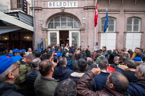 Büyükşehir Belediye Başkanı Tunç Soyer’e 9 Eylül İzmir’in kurtuluşunun 100’üncü yılı kutlamalarındaki konuşmasından dolayı İçişleri Bakanlığı tarafından açılan soruşturmaya, bir tepki de Belediye İş Sendikası’nın İzmir şubelerinden geldi. Egemenlik Evi önünde toplanan binlerce işçi, “Hak, hukuk, adalet”, “Tunç Başkan nerede biz oradayız”, “İzmir Tunç’tur, Tunç kalacak”, “Dik dur eğilme bu millet seninle”, “Aşkla İzmir Tunç’la İzmir” sloganları attı. Ankara’da olan ve uçağı rötar yaptığı için buluşmaya katılamayan Başkan Soyer, canlı bağlantı ile işçilere seslendi.