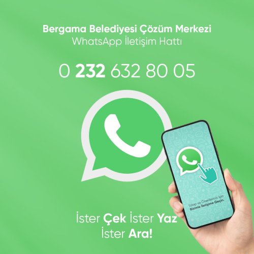 Vatandaşlar, Bergama Belediyesi Çözüm Merkezi Whatsapp hattı ile Bergama Belediyesi'ne ulaşarak sorunlarına hızlı bir şekilde çözüm bulabiliyor. Sorunların çözümü için 0232 632 80 05 numaralı whatsapp hattından yararlanılabiliyor. Bergama Belediyesi Çözüm Merkezi tarafından kaydedilen tüm talep, öneri ve bildirimler, ekipler tarafından en kısa sürede yanıtlanıyor.