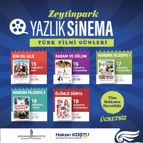 Bergama Belediyesi’nin düzenlediği ‘Yazlık Sinema Günleri’ Zeytinpark’ta 15 – 19 Ağustos tarihleri arasında gerçekleşecek. Eski zamanların en sevilen etkinliklerinden biri olan açık hava sinemalarını hatırlatmak, yaz akşamlarının serinliğinde keyifle film izlemek için düzenlenen etkinlik, 5 gece boyunca sürecek. “Türk Filmi Günleri” konseptinde düzenlenecek film geceleri, saat 21.30’da ücretsiz biçimde halkla buluşacak.