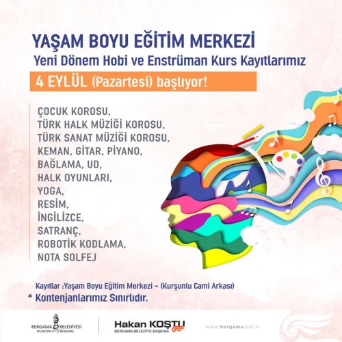 MEDYA EGE - Bergama Belediyesi tarafından oluşturulan ve meslek edindirme, hobi, görsel sanatlar, sahne sanatları, kişisel gelişim, üniversiteye hazırlık kurslarının yanı sıra sergi, konferans, tiyatro gibi çeşitli etkinliklere de yer veren Yaşam Boyu Eğitim Merkezi’nde yeni dönem hobi ve enstrüman kurs kayıtları başlıyor.