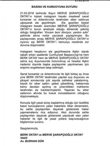 İlk olarak Berk Oktay’ın eşi Merve Şarapçıoğlu’nun Instagram hesabından Merve Şarapçıoğlu’nun dayak yediğini iddia edilen fotoğraflar sızdırıldı. Fotoğrafın bir estetik operasyon sonrası çekildiği ihtimali üzerinde de durulurken daha sonra çiftin çok özel fotoğrafları paylaşılmıştı… Bu olay sonrası Merve Şarapçıoğlu hesabı dondurmuştu.