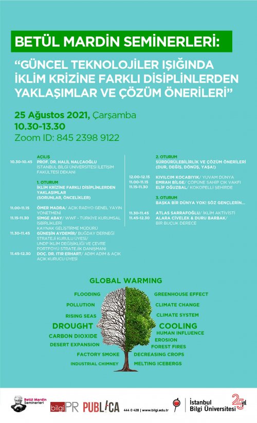 İstanbul Bilgi Üniversitesi İletişim Fakültesi, “Betül Mardin Seminerleri” dizisiyle, Türkiye ve dünya gündemini farklı disiplinlerden başarılı uzmanların sözcülüğünde ele almaya devam ediyor. “Betül Mardin Seminerleri” kapsamında online olarak düzenlenecek etkinliğin başlığı tüm dünyada etkileri günden güne artarak devam eden iklim krizine dikkat çekmek amacıyla “Güncel Teknolojiler Işığında İklim Krizine Farklı Disiplinlerden Yaklaşımlar ve Çözüm Önerileri” olarak belirlendi. Etkinlikte iklim krizinin boyutları, STK’lara, kurumlara ve bireylere düşen önemli roller ve çözüm önerileri tartışılacak