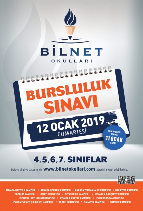 12 Ocak 2019 tarihinde yapılacak ve 4, 5, 6 ve 7. sınıf öğrencilerinin katılabileceği Bursluluk Sınavı Bilnet Okullarının bütün kampüslerinde eş zamanlı gerçekleştirilecek. Sınavda başarılı olan öğrencilere gelecek yıl kayıtlarında özel avantajların sunulacağı “Bilnet Okulları Bursluluk Sınavı” ile ilgili detaylı bilgiye www.bilnetokullari.com web sitesinden ulaşılabilirsiniz.