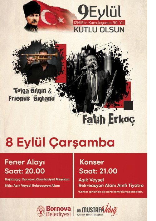 Bornova Belediye Başkanı Dr. Mustafa İduğ, İzmir’in kurtuluş günü olan 9 Eylül’ü coşku içinde kutlayacaklarını söyledi. Kutlamaların 8 Eylül akşamı Bornova Cumhuriyet Meydanı’ndan Aşık Veysel Rekreasyon Alanı’na uzanacak kortej geçişi ile başlayacağını belirten Başkan İduğ, “Ardından usta sanatçımız Fatih Erkoç, Caz Trompet Sanatçısı,Besteci Tolga Bilgin ve Friends Bigband ile birlikte olacak. 9 Eylül sabahı ise her yıl olduğu gibi Belkahve’deki 16.5 metrelik Atatürk Heykeli önündeki törenlerde buluşacağız.” diye konuştu.