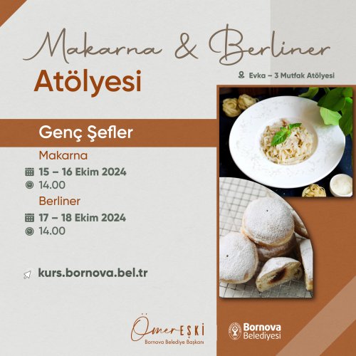 MEDYA EGE – Bornova Belediyesi Mutfak Atölyesi, yemek ve tatlı yapmanın inceliklerini öğrenmek isteyen Bornovalılar için mesleki eğitim merkezi gibi çalışıyor. Bornova Belediyesi bu sefer genç şefler için Makarna & Berliner Atölyesi düzenleyecek.