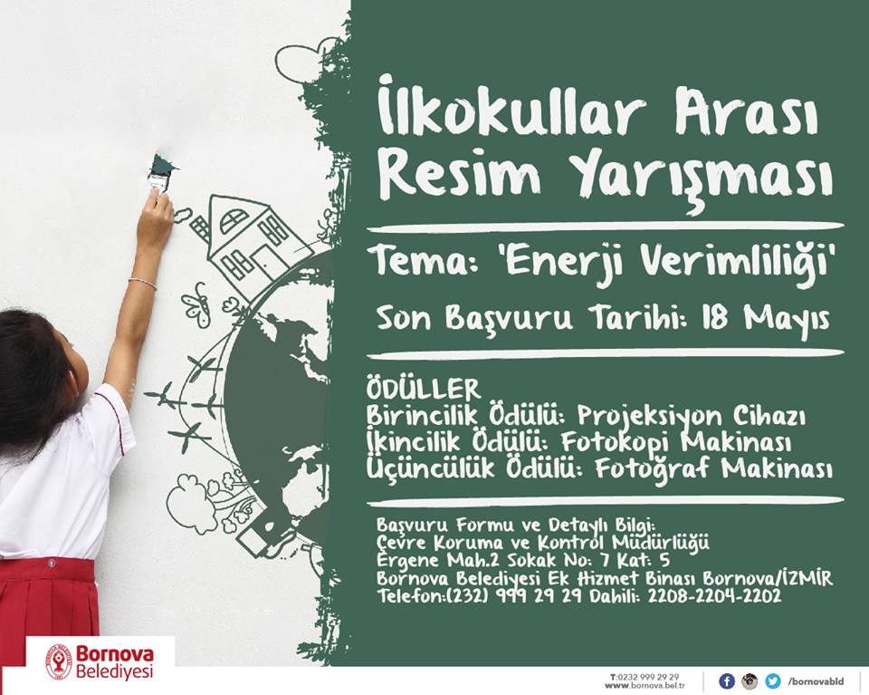 Bornova Belediyesi çocukların, hayal güçlerini kullanması ve enerji verimliliği konusunda bilinç oluşturabilmek amacıyla ilkokullar arası resim yarışması düzenliyor. “Enerji Verimliliği” konulu yarışmaya ilçede bulunan tüm ilkokullar seçecekleri 3 eser ile katılabilecek. Yarışmada birinci olan okula Projeksiyon Cihazı verilirken ikinci okula Fotokopi Makinası, üçüncü okula ise fotoğraf makinası hediye edilecek.