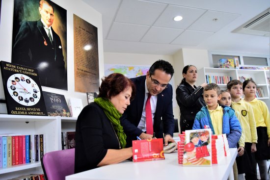 Altındağ Hasan Ali Yücel Cumhuriyet Kitaplığı’nda düzenlenen buluşmada çocuklar için kitaplarını imzalayan yazar, ilk imzaladığı kitabı da Bornova Belediye Başkanı Olgun Atila’ya hediye etti.