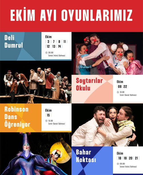 MEDYA EGE - İzmir Büyükşehir Belediyesi Şehir Tiyatroları Ekim ayında Deli Dumrul, Soytarılar Okulu, Robinson Dans Öğreniyor ve Bahar Noktası isimli oyunlarla İzmirli seyircinin karşısına çıkacak.