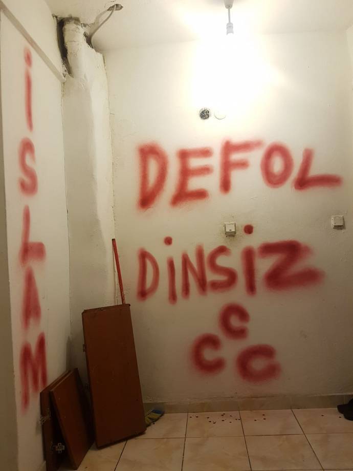 Bahçelievler ilçesinde Alevi bir ailenin kapısına üç hilal sembolleri çizilerek, çarpı işareti konuldu. Kapıya "Defol dinsiz" ve "İslam" diye yazılama yapıldı.