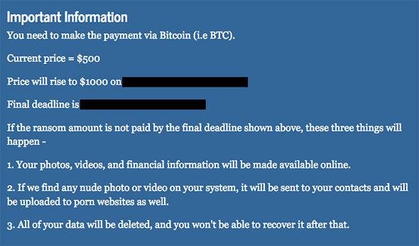 Kullanıcıların ekranında beliren mesajla dosyaları kurtarmak için ödeme yapılması gerektiği yazıyor, ödeme yapılmazsa verilerinizi kurtaramayacağınız belirtilirken tehditler sıralanıyor. Virüsün fotoğraflarınızın porno sitelere yüklenebileceği tehditi ise tehlikenin boyutlarını gözler önüne seriyor. Dosyalarınıza ulaşmanız karşılığında sizden istenen para ise hemen öderseniz 500 dolar ve zamanla 1000 dolara ulaşabileceği belirtiliyor. Virüsten korunmak için güvensiz sitelerde gezinmemeniz ve güncel bir antivirüs programı kullanmanız gerekiyor.