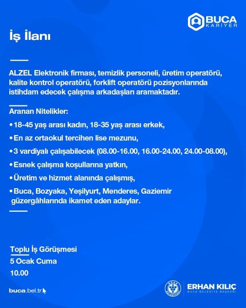Buca Belediyesi, iş arayışında olan vatandaşlara ve işverenin kalifiye eleman sorununa destek olabilmek için hayata geçirdiği Buca Kariyer Platformu aracılığıyla, ALZEL Elektronik firması için toplu iş görüşmesi düzenleneceğini duyurdu.