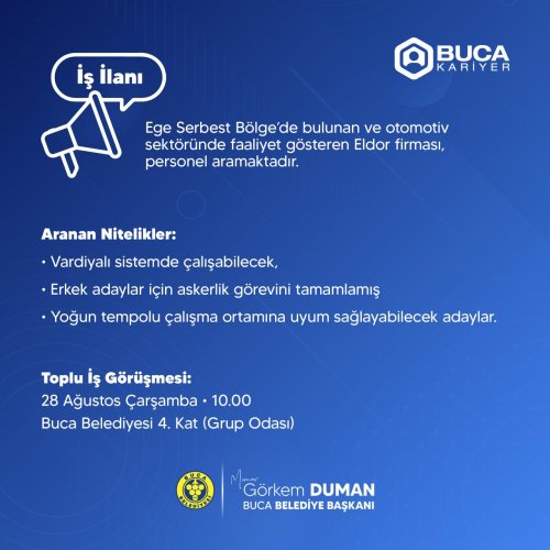 Buca Belediyesi iş arayışında olan vatandaşlara ve işverenin kalifiye eleman sorununa destek olabilmek için hayata geçirdiği Buca Kariyer Platformu aracılığıyla, Eldor firması için toplu iş görüşmesi düzenleneceğini duyurdu.