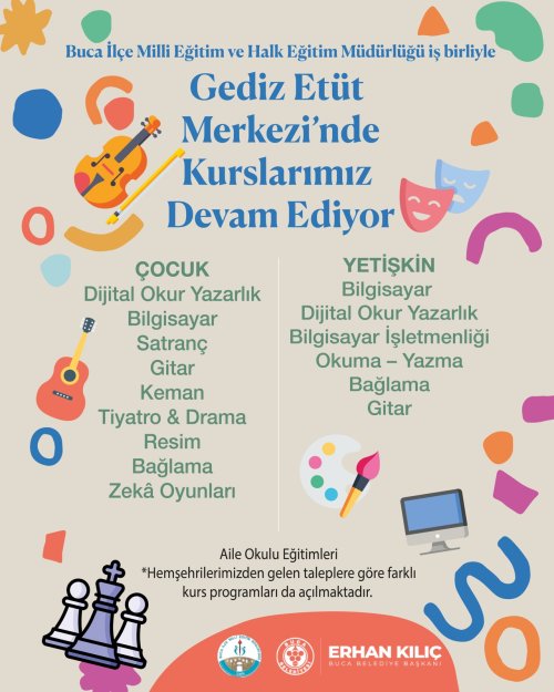 Buca Belediyesi tarafında yapılan açıklamada şunlar aktarıldı; “Buca İlçe Milli Eğitim ve Halk Eğitim Müdürlüğü iş birliğiyle Gediz Etüt Merkezimizde çocuk ve yetişkin kurs kayıtlarımız devam ediyor… Kayıt ve iletişim için: 232 439 00 55 (3730-3731) Gazeteci Yazar İsmail Sivri Bulvarı, Mustafa Kemal Mahallesi No:377-1/B”
