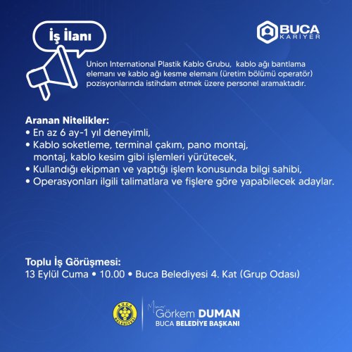 Buca Belediyesi'nin sosyal medya hesabından yapılan açıklamaya göre; en az 6 ay-1 yıl deneyimli, kablo soketleme, terminal çakım, pano montaj, montaj, kablo kesim gibi işlemleri yürütecek, kablo ağı bantlama elamanı ve kablo ağı kesme elemanı personellere ihtiyaç duyuluyor.
