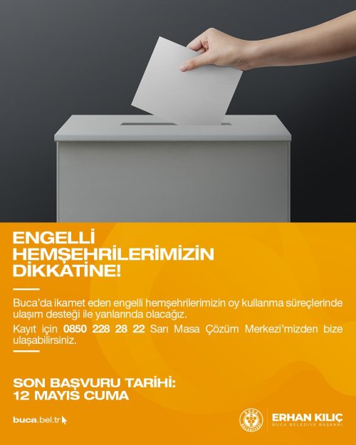 Buca ilçesinde ikamet eden engelli vatandaşların oy kullanma süreçlerinde kolaylık sağlayacak olan ulaşım desteğine son başvuru tarihinin 12 Mayıs cuma günü olduğu bildirildi.