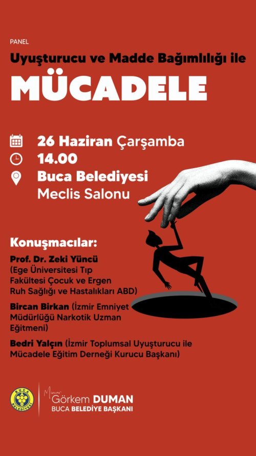 Buca Belediyesi, 26 Haziran Çarşamba günü saat 14.00’te Meclis Salonu’nda Uyuşturucu ve Madde Bağımlılığı ile Mücadele paneli düzenleyecek. Panel, Ege Üniversitesi Tıp Fakültesi Çocuk Ergen Ruh Sağlığı ve Hastalıkları Ana Bilim Dalı Uzmanı Prof. Dr. Zeki Yüncü, İzmir Emniyet Müdürlüğü Narkotik Uzman Eğitmeni Bircan Birkan ve İzmir Toplumsal Uyuşturucu ile Mücadele Eğitim Derneği Kurucu Başkanı Bedri Yalçın’ın katılımıyla gerçekleşecek.