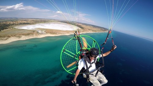 Edirne'de buharlaşan göl tuzla kaplanırken, paramotor pilotu Yılmaz Özkaya, bu sıra dışı manzarayı havadan görüntüledi.